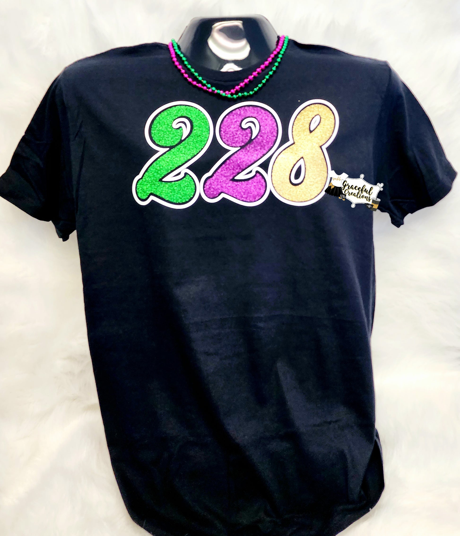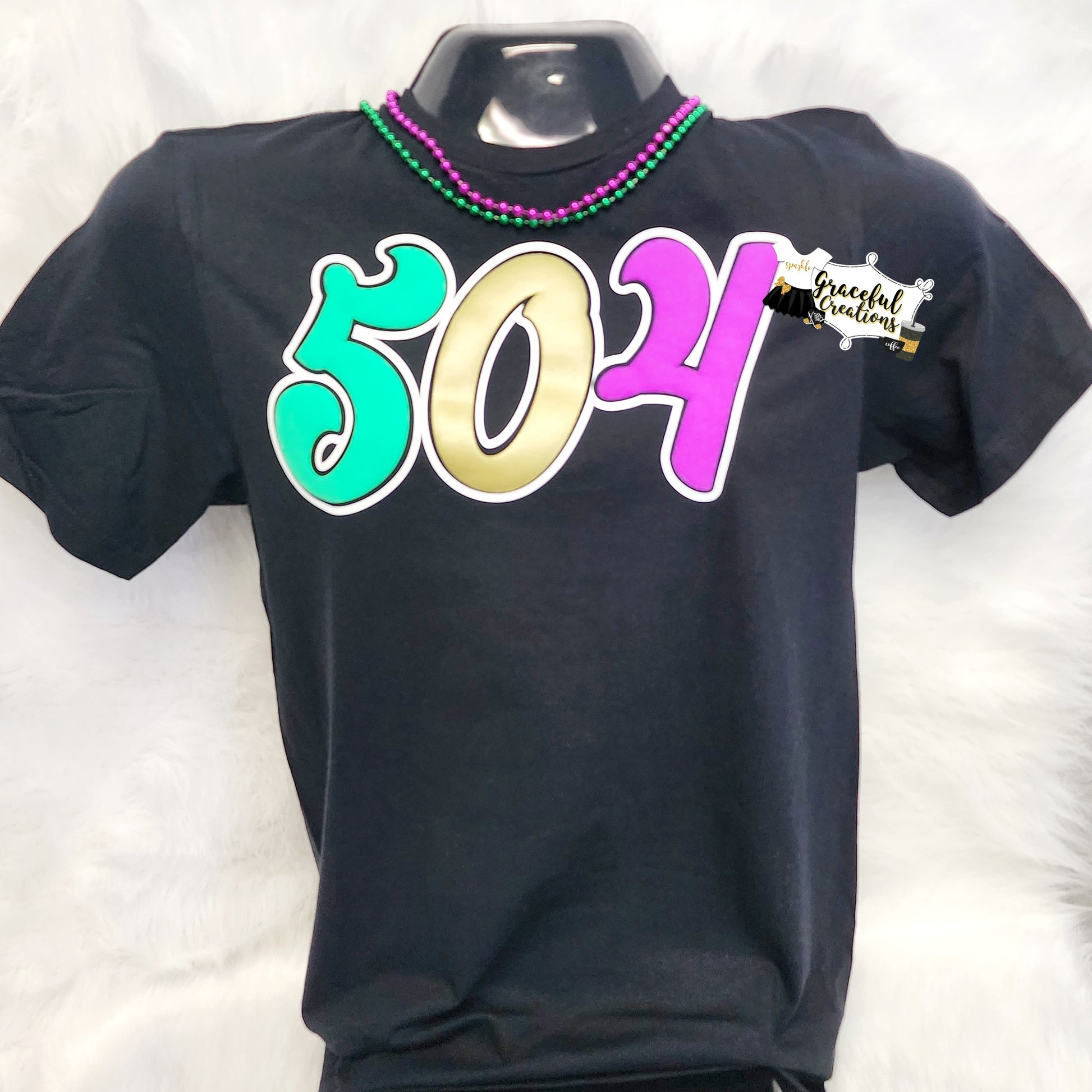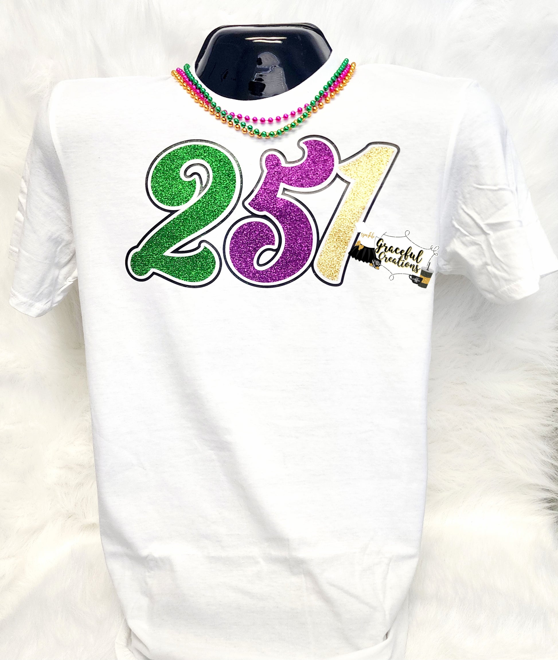 Area Code - Rep Your City Mardi Gras Shirt. (This listing is for one Area Code - Rep Your City Mardi Gras Tee shirt.)