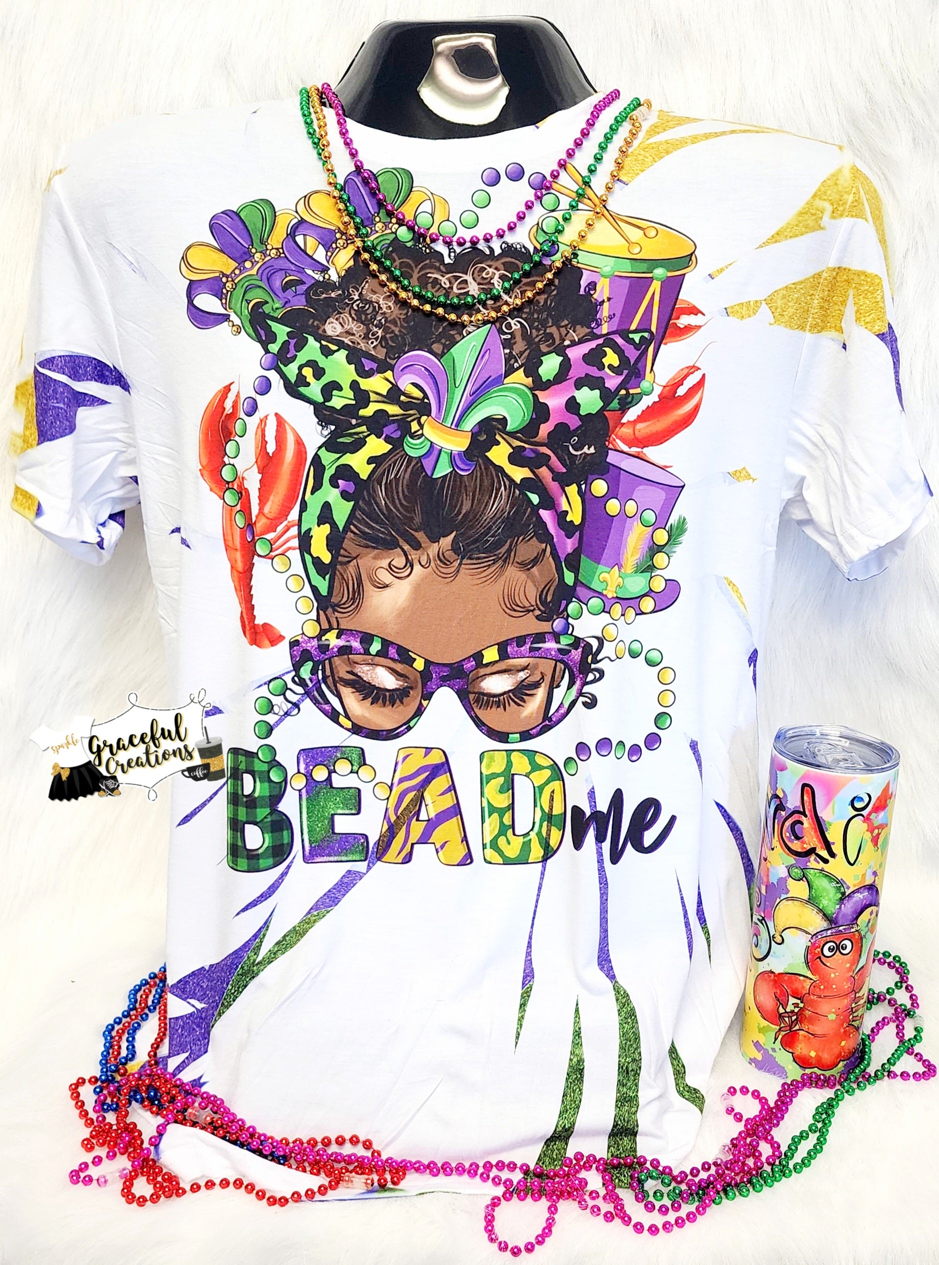 Afro Messy Bun Bead Me Scrunch Tie Dye Mardi Gras Custom T-Shirt