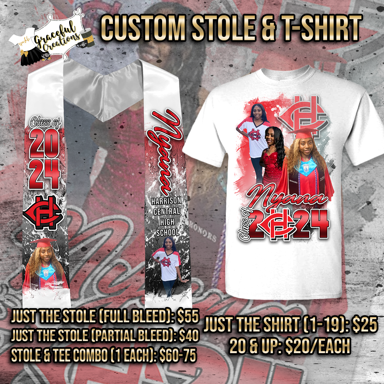 The design comes with 1 logo, Graduate Name, Class Year, and 2 photos. (The same two photos are used for both the stole and the t-shirt.)