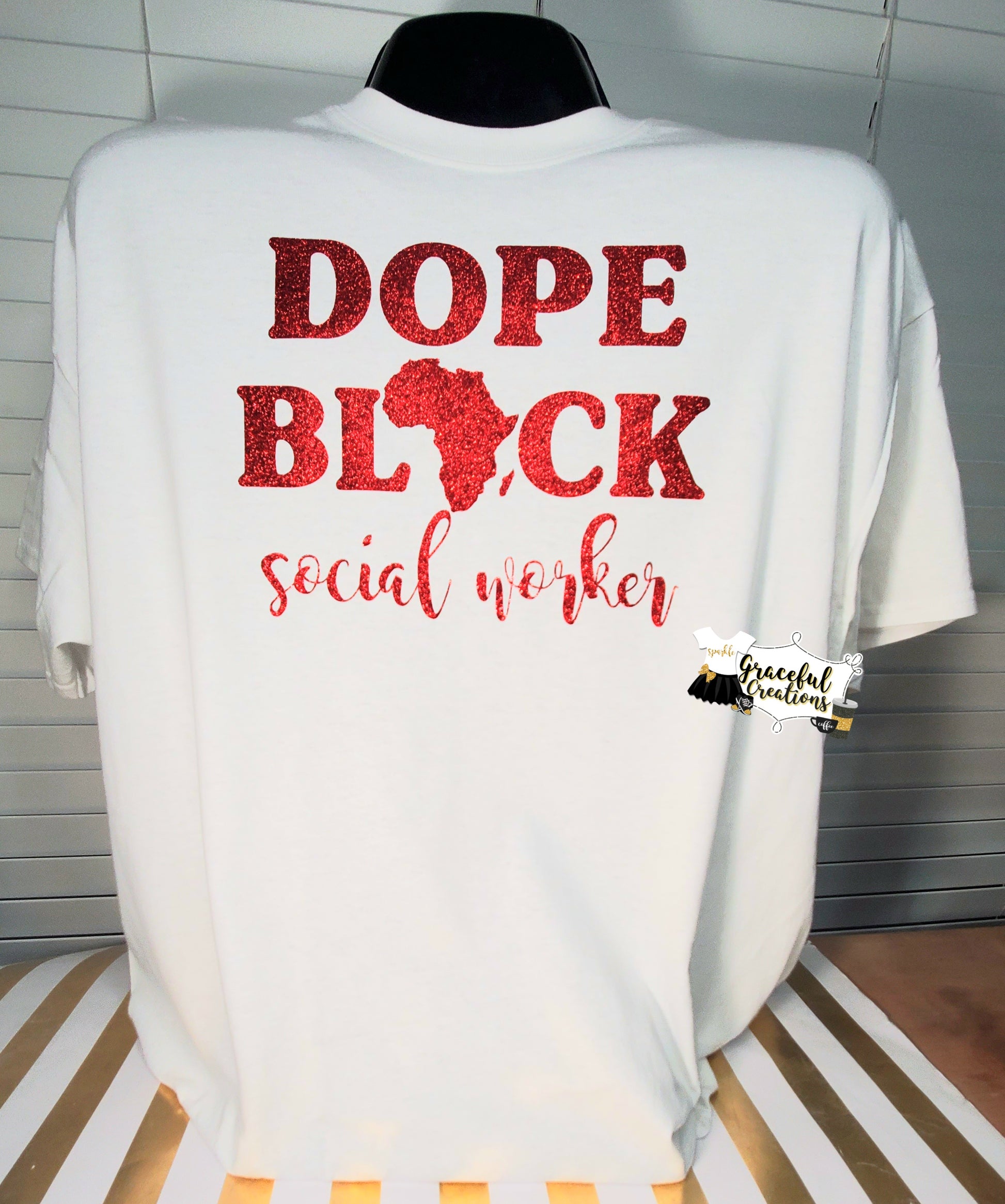Dope Black Social Worker Custom Shirt. (This listing is for one Dope Black Social Worker Tee shirt.) When placing your order, please specify in the CustomizeIt/Notes section: 1. Your size (We use unisex tees.) 2. Shirt color 3. Design color choice. All shirts are made to order by myself and my team.
