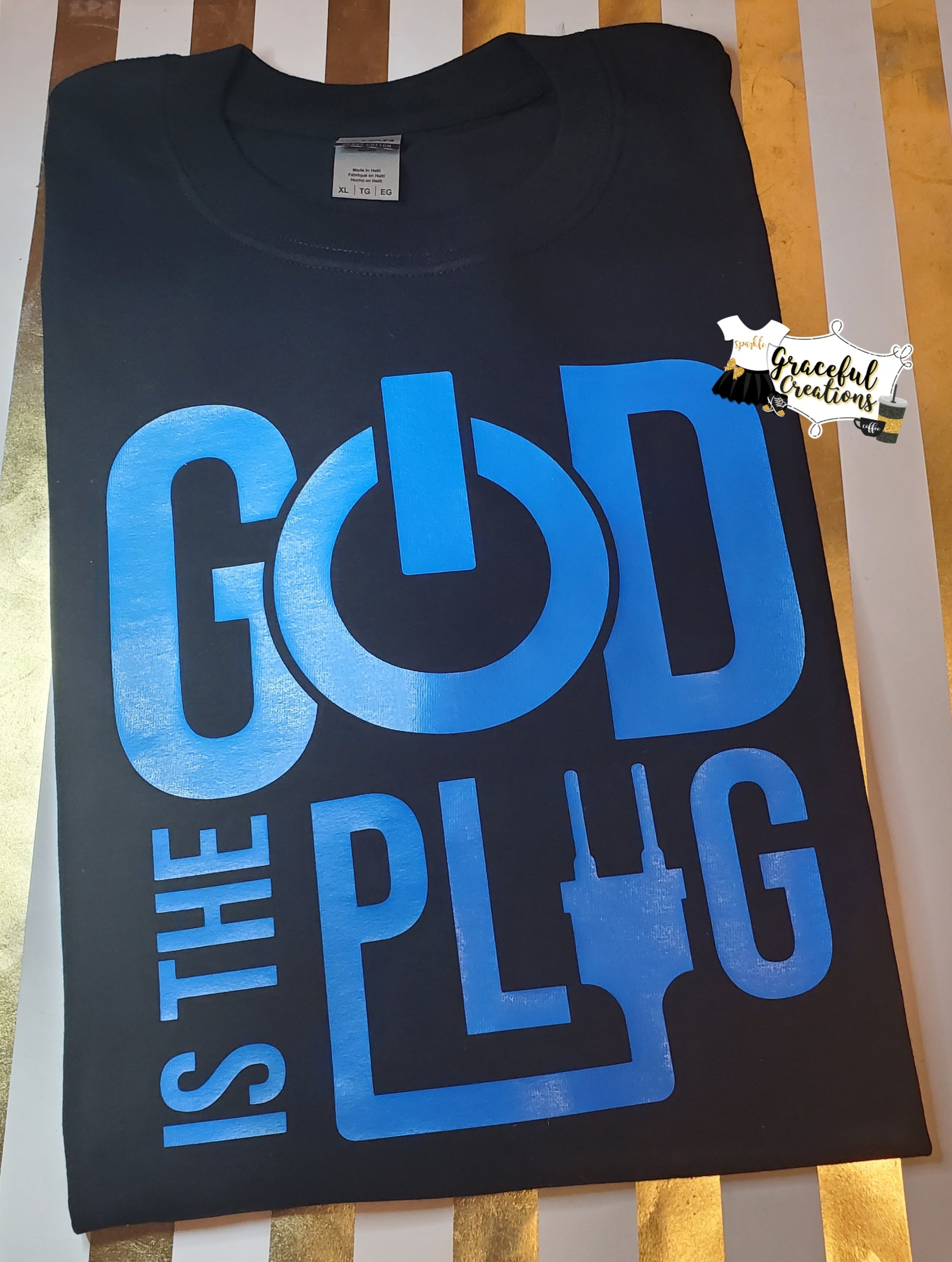 God Is The Plug Custom Shirt. (This listing is for one God Is The Plug Tee shirt.) When placing your order, please specify: 1. Your size (We use unisex tees.) 2. Shirt color 3. Design color choice. All shirts are made to order by myself and my team.
