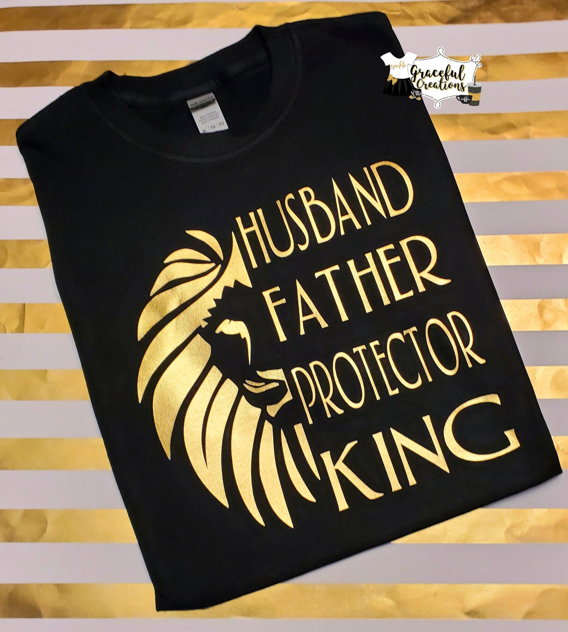 Husband, Father, Protector, King Lion Head Tee Shirt. (This listing is for one Husband, Father, Protector, King Lion Head Tee Shirt.) When placing your order, please specify: 1. Your size (We use unisex tees.) 2. Shirt color. 3. Design color. All shirts are made to order by myself and my team.