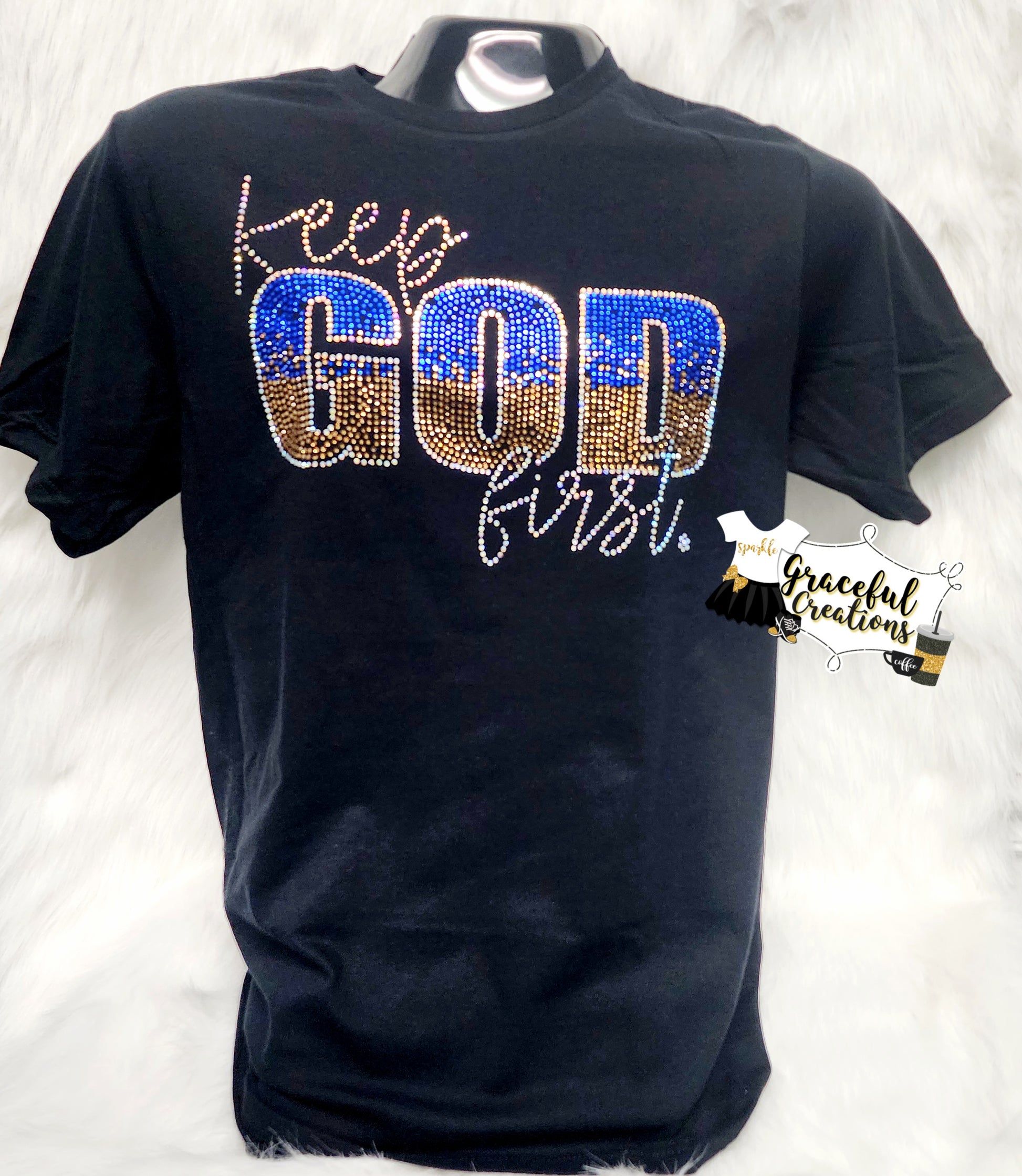 (This listing is for one Keep God First Rhinestone Tee shirt.) When placing your order, be sure to select your shirt color and stone color(s).