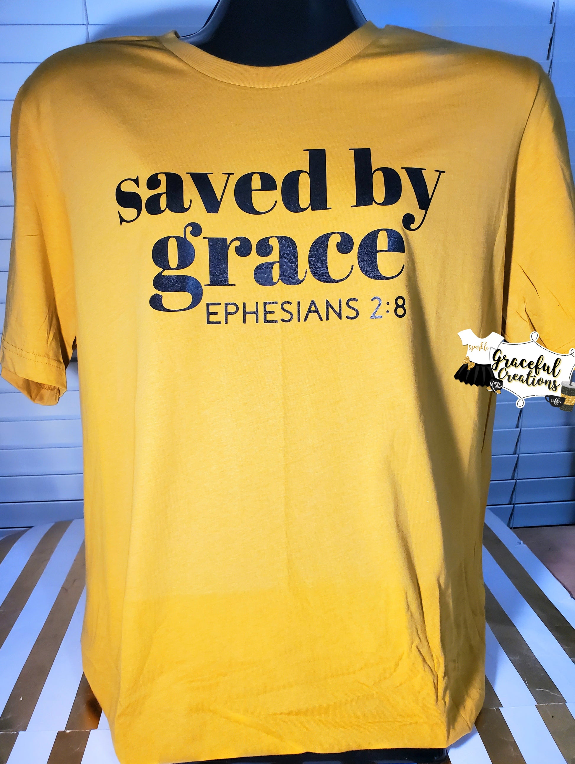 Saved By Grace - Ephesians 2:8 Custom Shirt. (This listing is for one Saved By Grace - Ephesians 2:8 Tee shirt.) When placing your order, please specify in the Customize It/Notes Section: 1. Your size (We use unisex tees.) 2. Shirt color 3. Design color choice. All shirts are made to order by myself and my team.