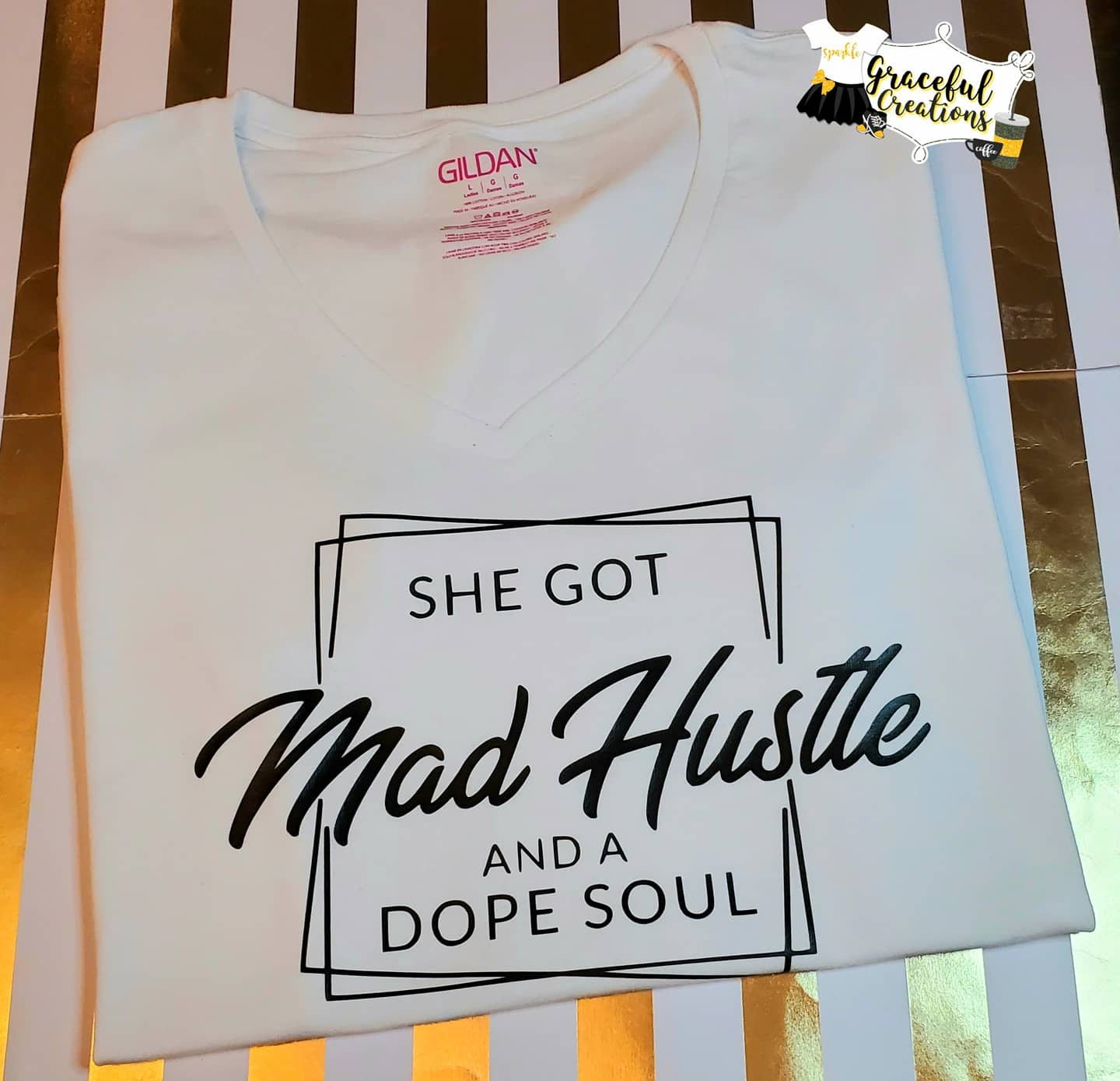 She Got Mad Hustle and a Dope Soul Tee Shirt. (This listing is for one "She Got Mad Hustle and a Dope Soul" Tee shirt.) When placing your order, please specify: 1. Your size (We use unisex tees.) 2. Shirt color. All shirts are made to order by myself and my team.
