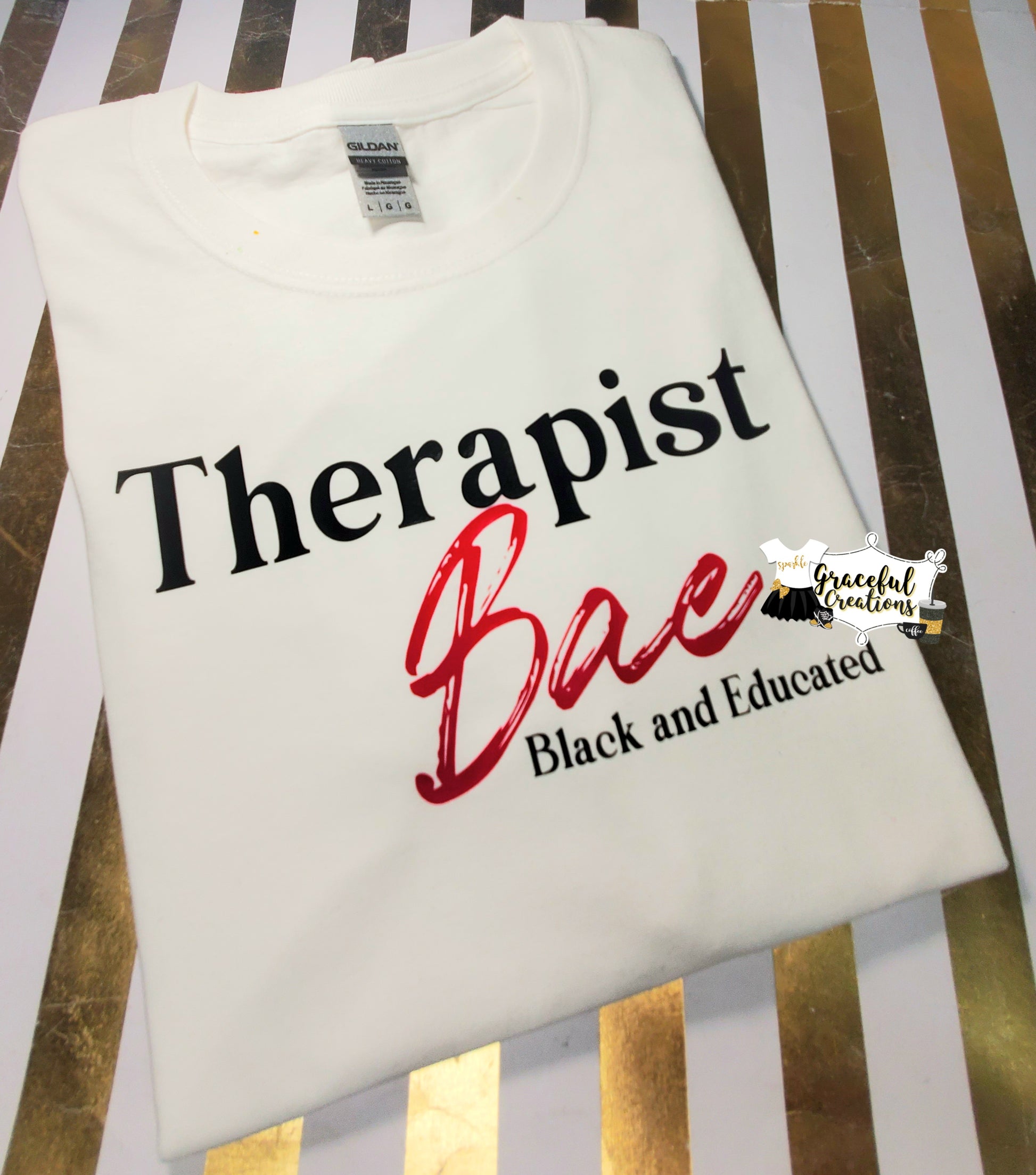 Therapist Bae, Black and Educated Custom Shirt. (This listing is for one Therapist Bae, Black and Educated Tee shirt.) When placing your order, please specify in the Customize It/Notes section: 1. Your size (We use unisex tees.) 2. Shirt color 3. Design color choice. All shirts are made to order by myself and my team.